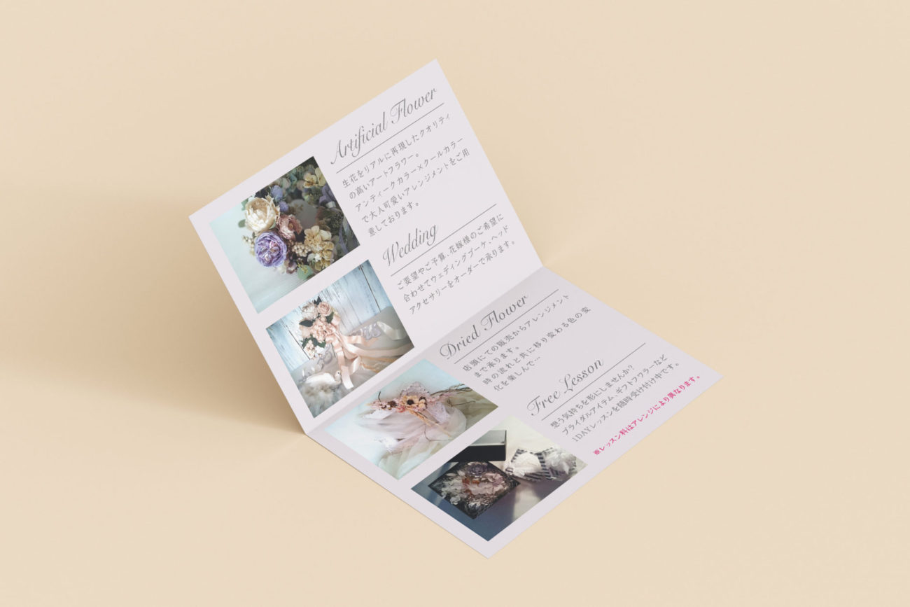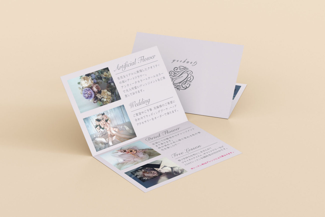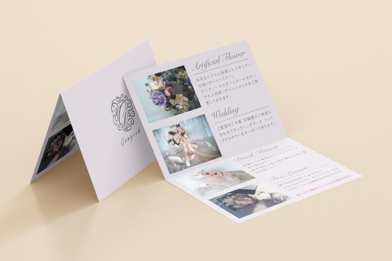宜野湾市大謝名にあるアーティフィシャルフラワーショップ「Grayish Interior Flower」さまのショップカード制作を担当いたしました。お客さまの目にとまって手に取ってもらえるように2つ折りで立てて置くことを提案。デザインもショップの世界観を表現できたと思います。