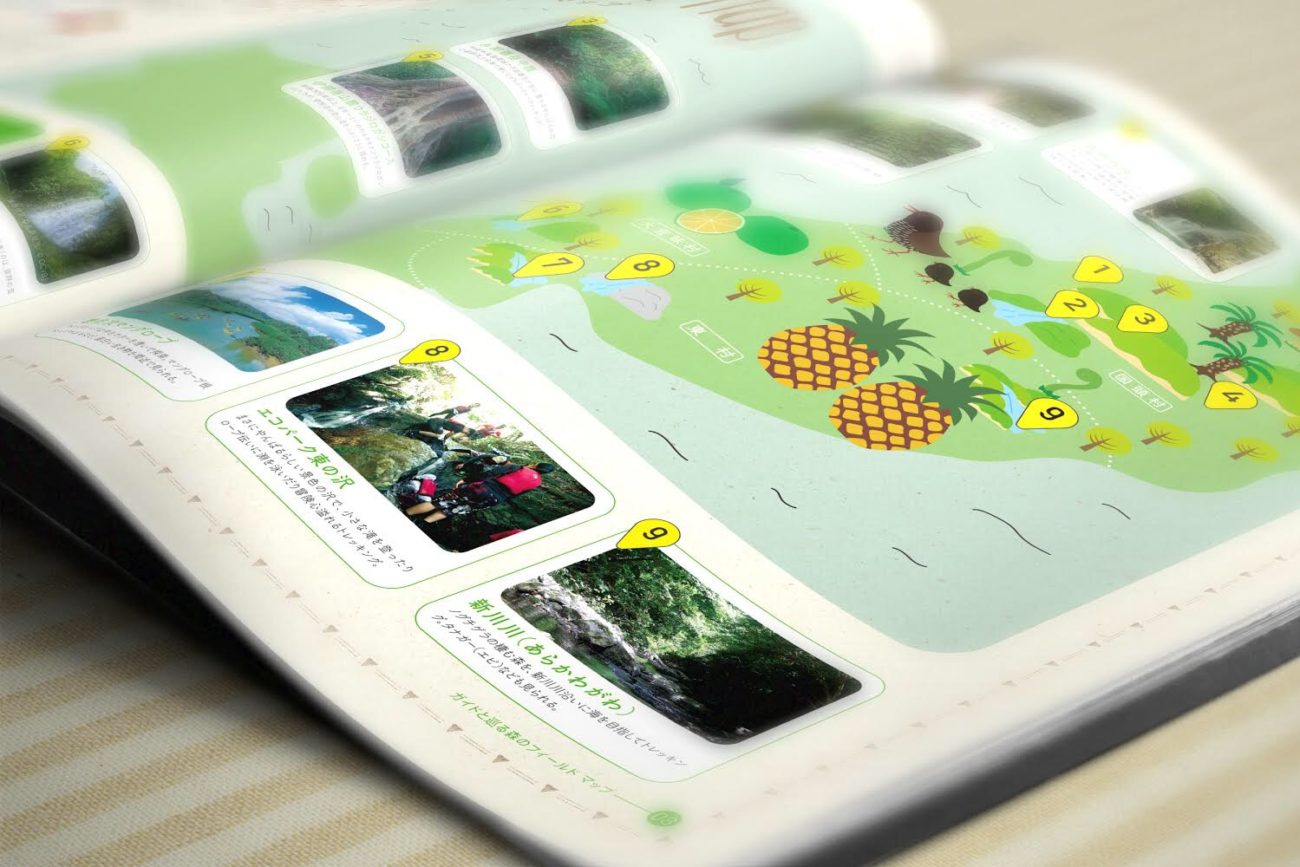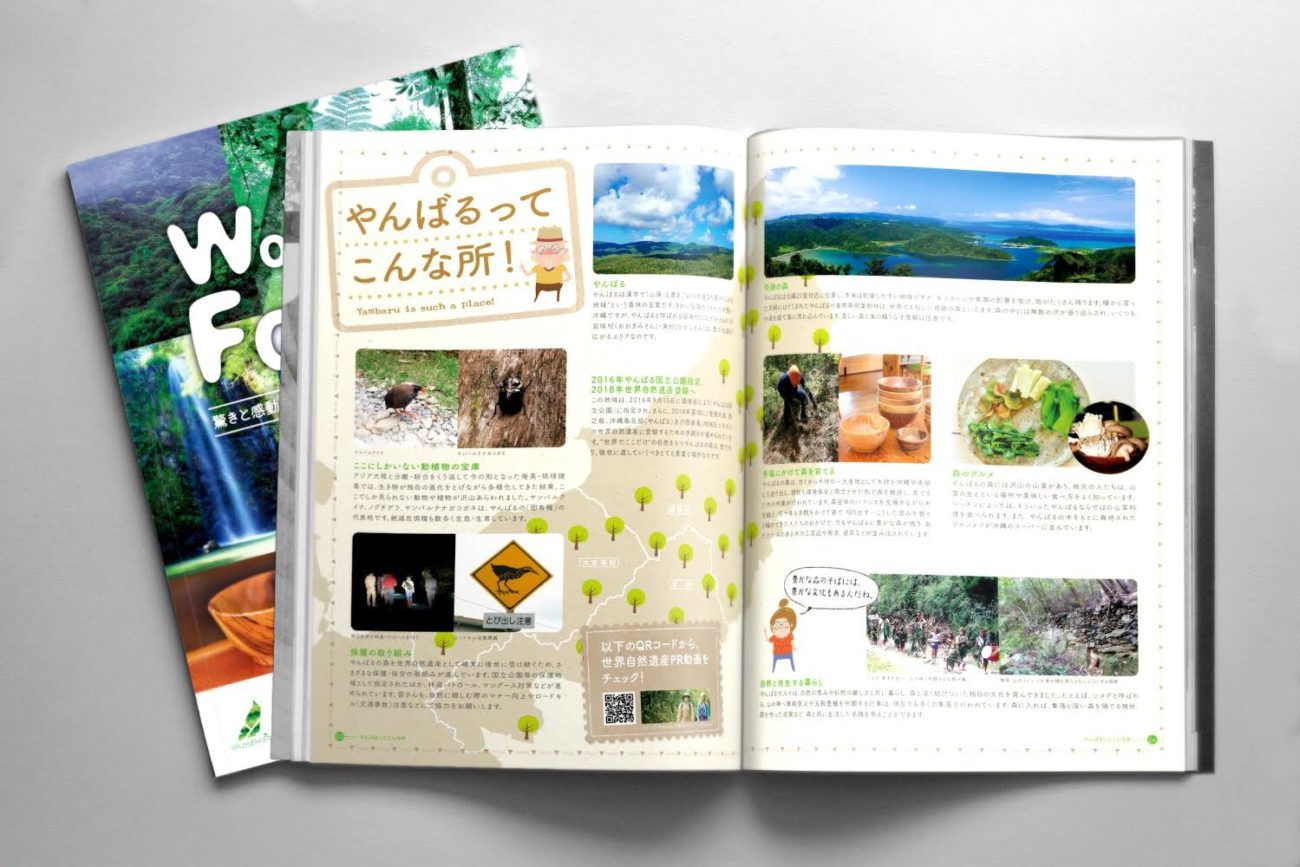 東村観光推進協議会よりパンフレット制作の依頼があり、沖縄本島北部に位置するやんばる3村(国頭・大宜味・東)について情報を発信したいとの事で、自然豊かなやんばるの森や川、農作物を紹介しつつ、様々なアクティビティも実はやんばるにはたくさんあるということを紹介する内容でした。ワンダフルフォレストというプロジェクト名なので、ワンダフルフォレストのロゴを制作し、ロゴのイメージに合わせて書体選定、カラー設定、台割等を決めて制作しました。また、老若男女に手に取ってもらえるようにイラストをイチからおこして、楽しくにぎやかな誌面に仕上げました。