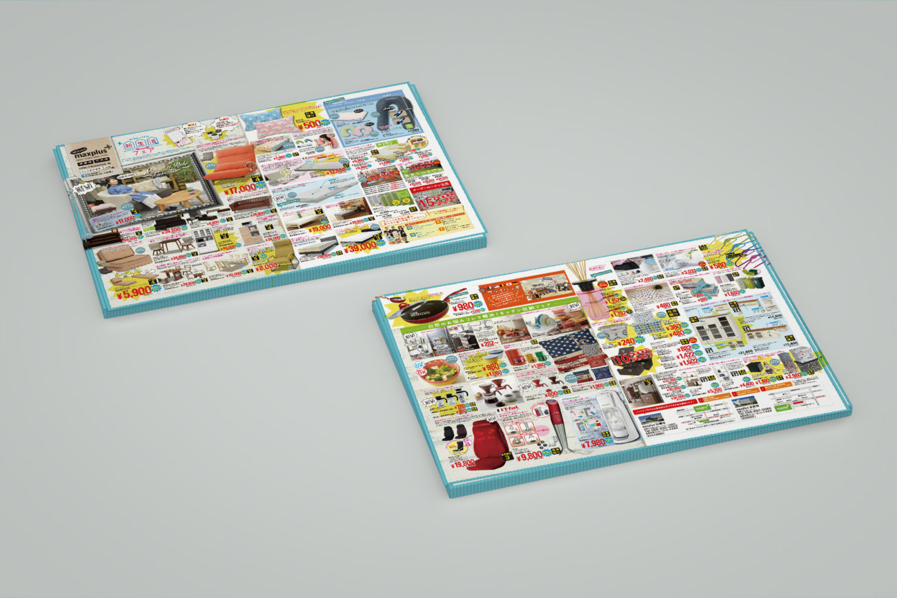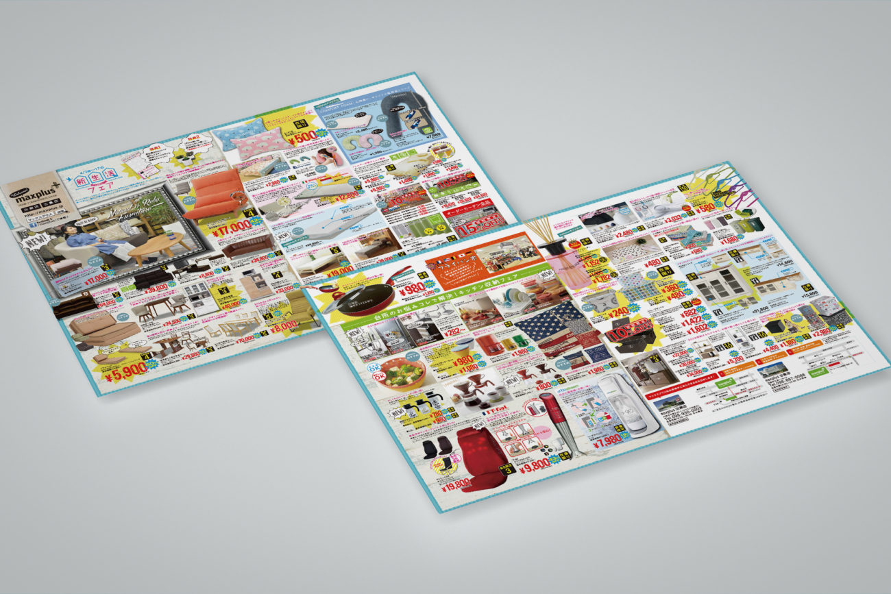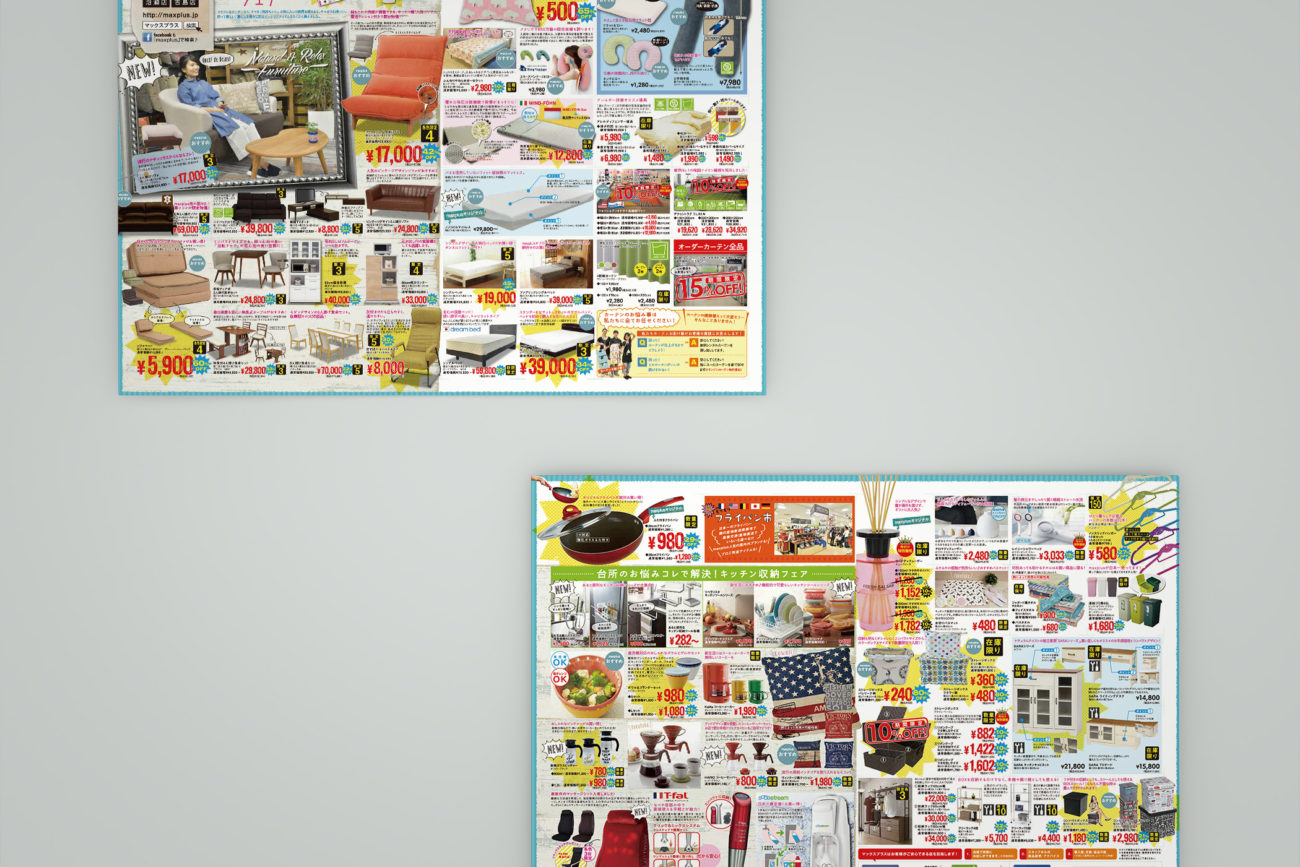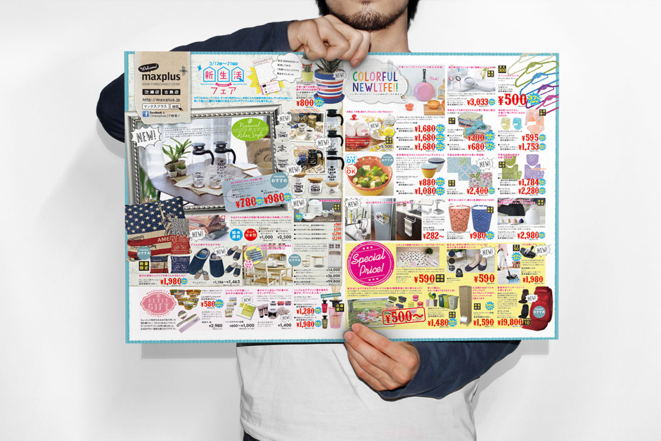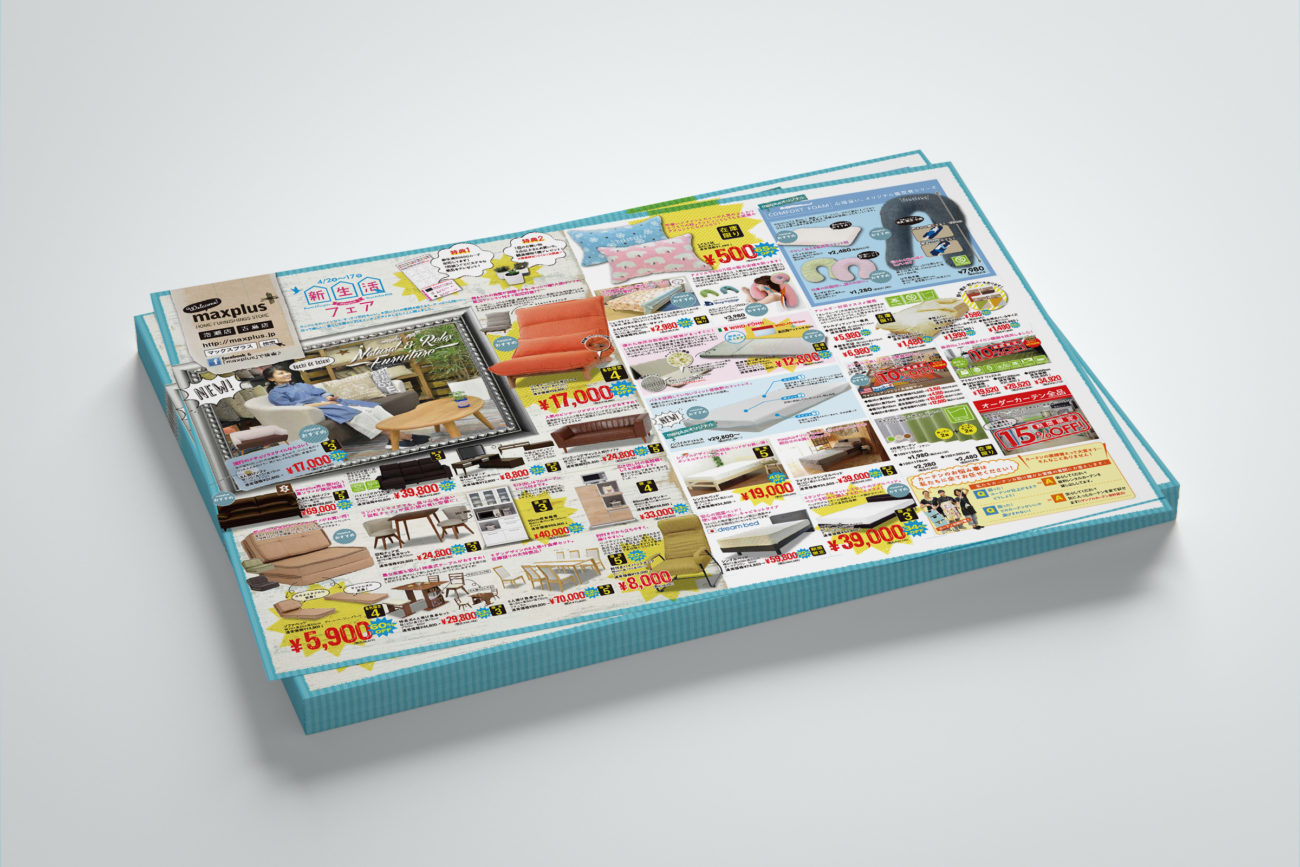 家具とインテリア雑貨の品揃えが豊富なライフスタイルショップmaxplusの新生活キャンペーンフライヤー制作を担当いたしました。